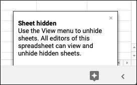 The first time you suppress a sheet tab after lunching your workbook, you’ll see a short confirmation message in the bottom right corner of your Google Sheet.